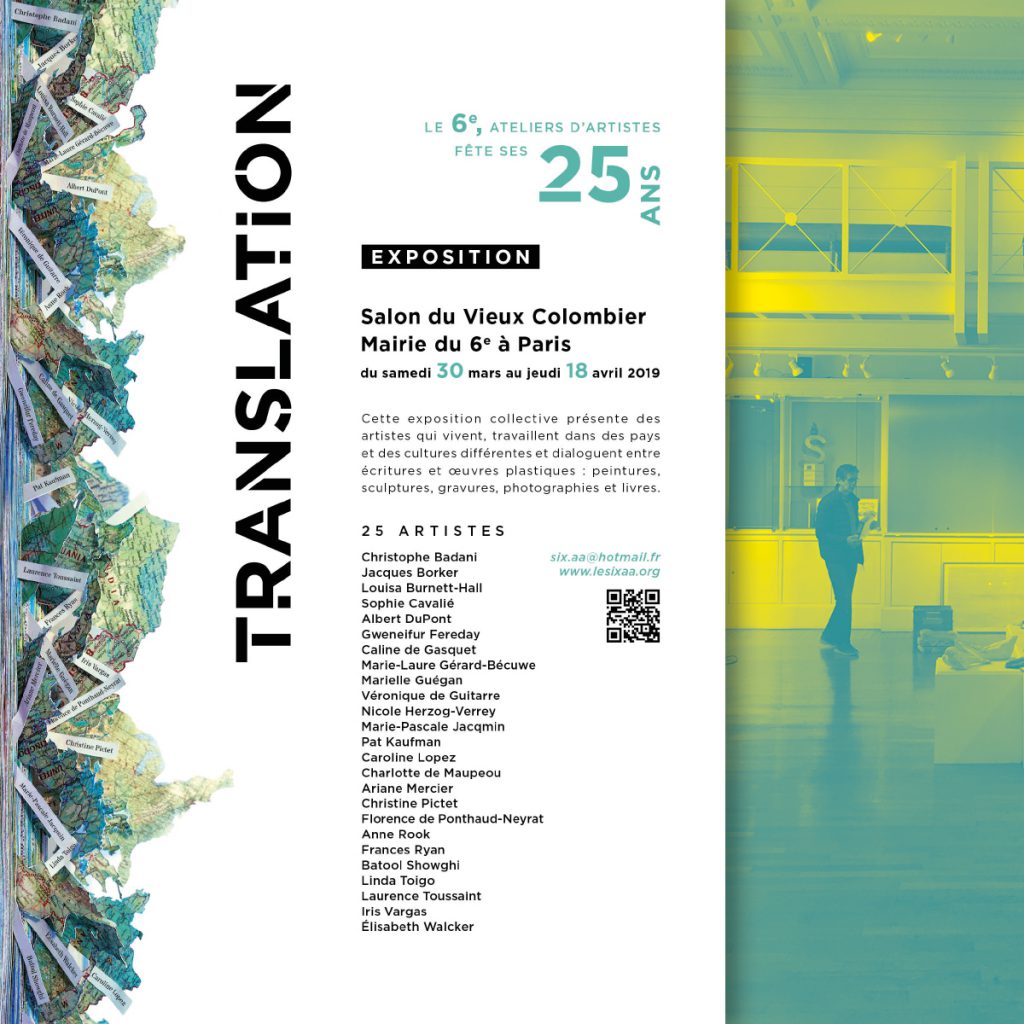 Participation à l’exposition collective « Translation »Du samedi 30 mars au Jeudi 18 avril 2019Vernissage le mercredi 3 avril à 12 h 00