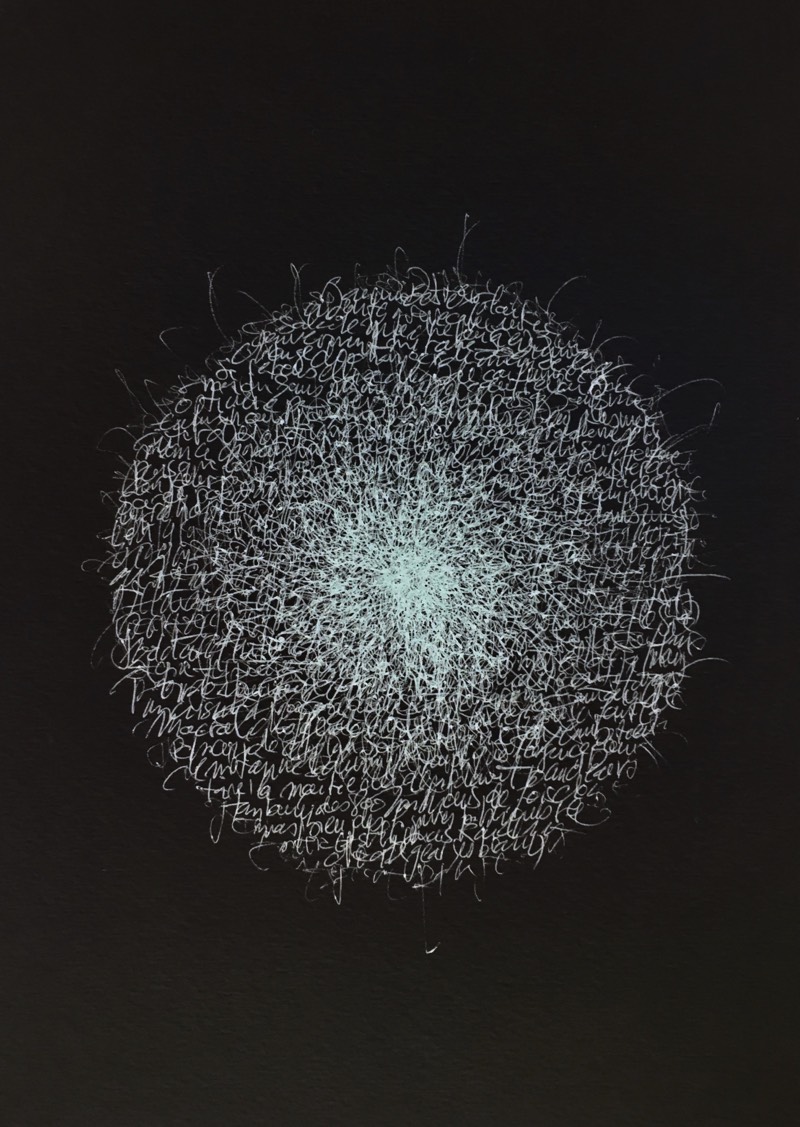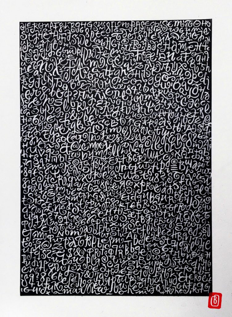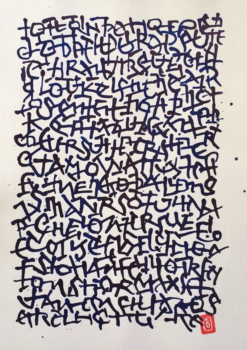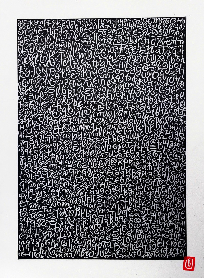 L’écriture asémique est l’élément fondateur de ces compositions. Accumulations, superpositions, rythmiques, formes géométriques, tous ces éléments forment une écriture à mi-chemin entre la lisibilité et l’illisibilité.