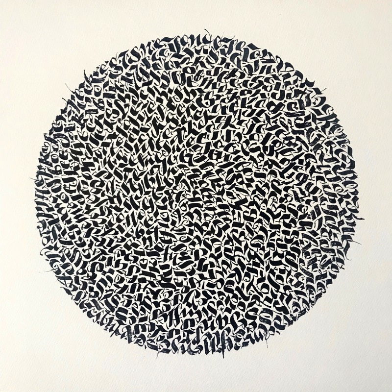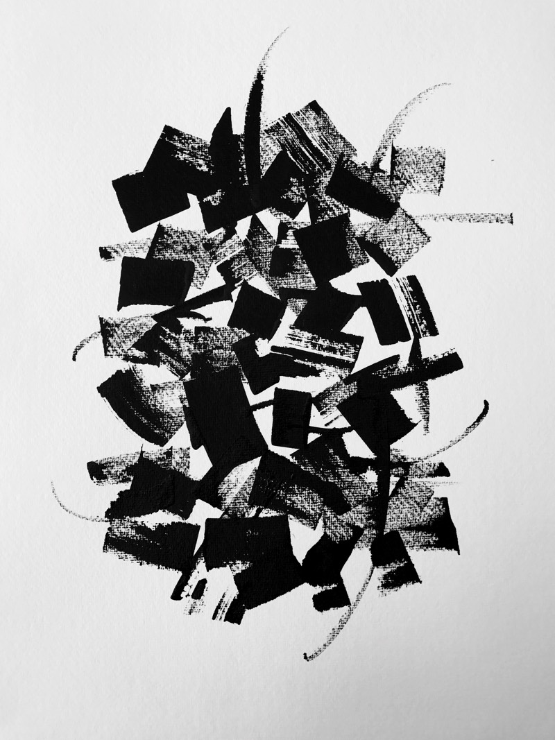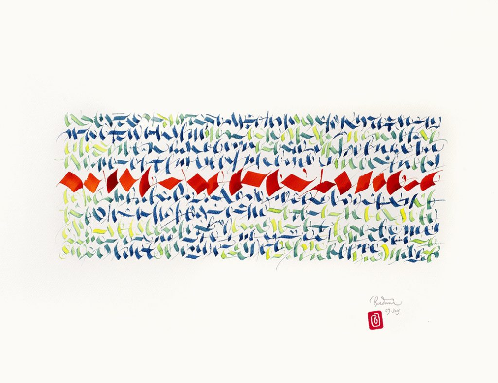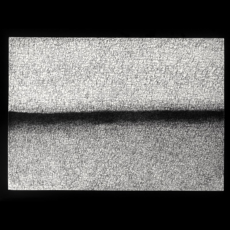 L’écriture asémique est l’élément fondateur de ces compositions. Accumulations, superpositions, rythmiques, formes géométriques, tous ces éléments forment une écriture à mi-chemin entre la lisibilité et l’illisibilité.