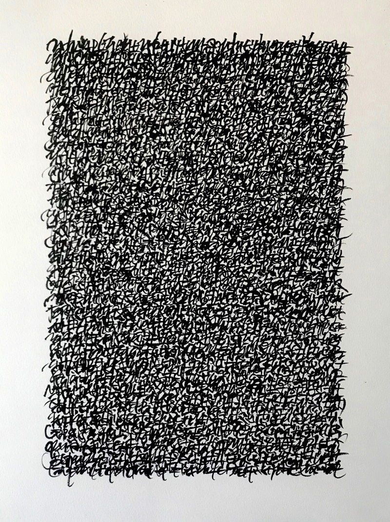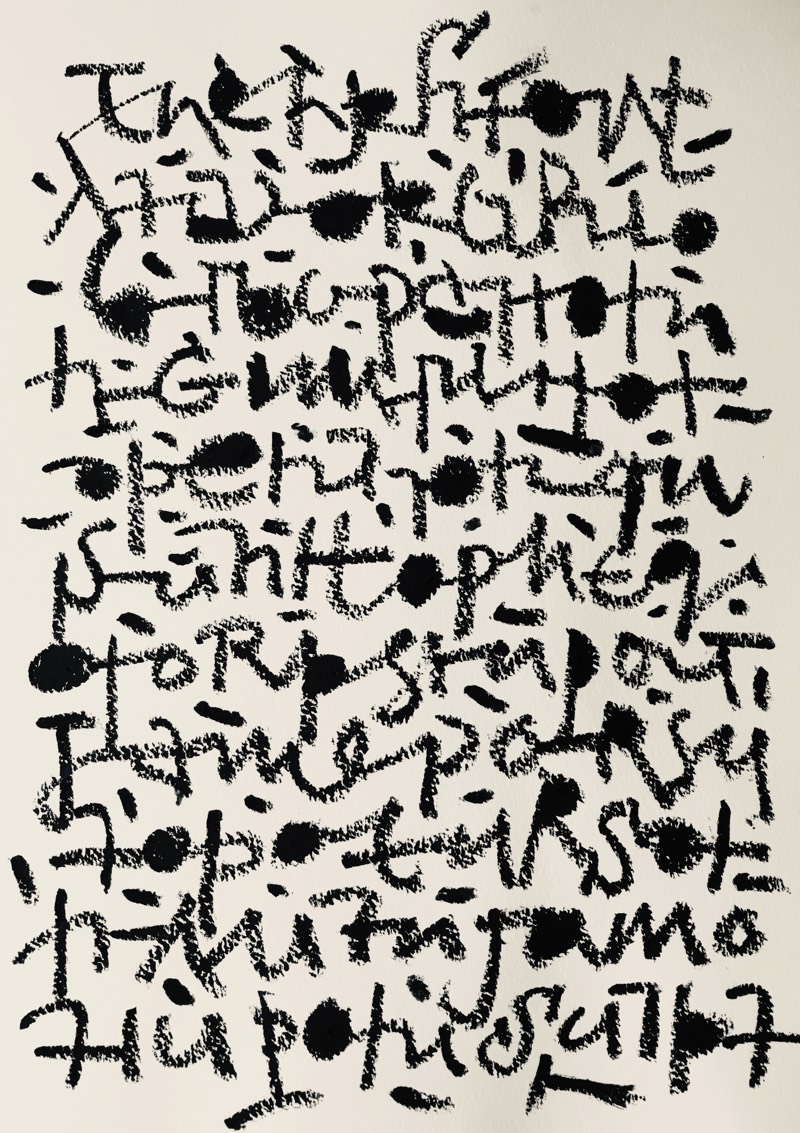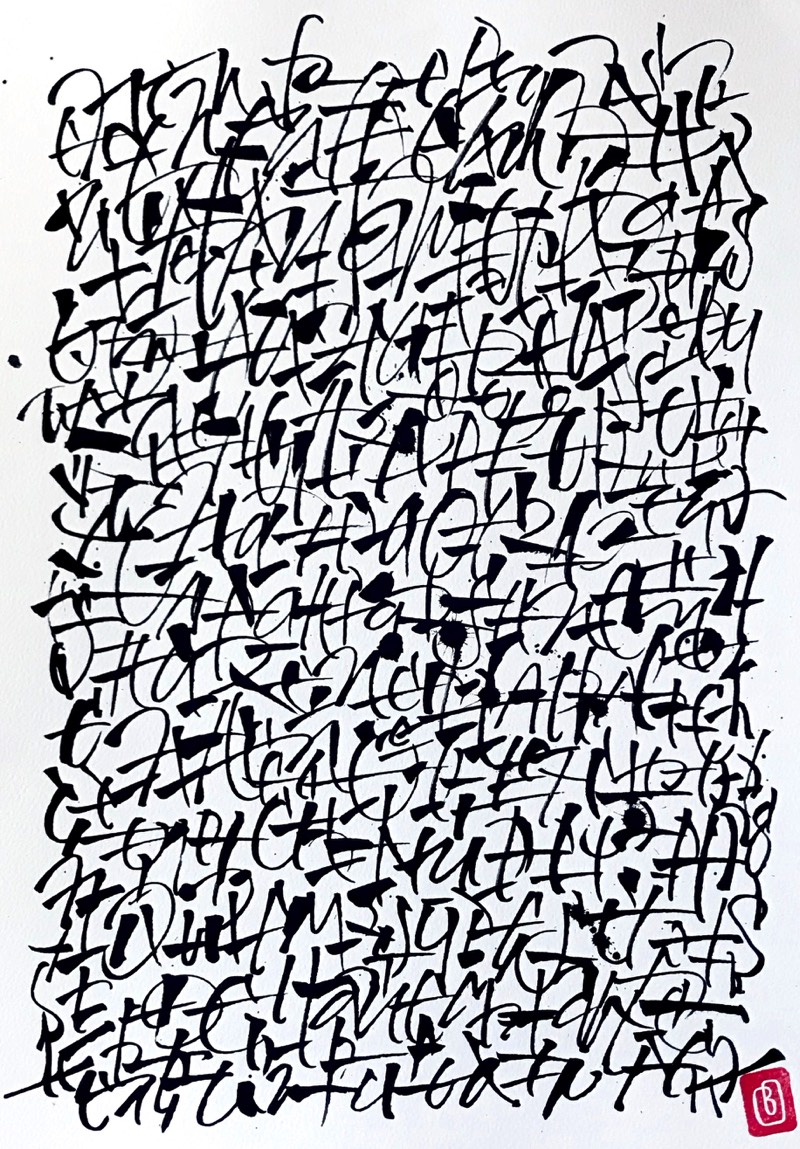 Écriture asémique, lettrisme et abstraction. Sélection de travaux réalisés sur papiers à l’encre, à la gouache ou à l’acrylique.